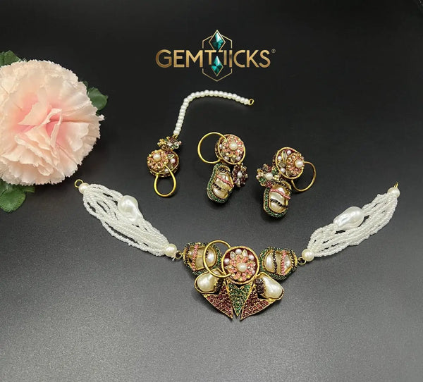 Turkish Chokar Set with Real Stones & Pearl Beads – Designer Antique Gold Plated Necklace with Matching Earrings & Tikka